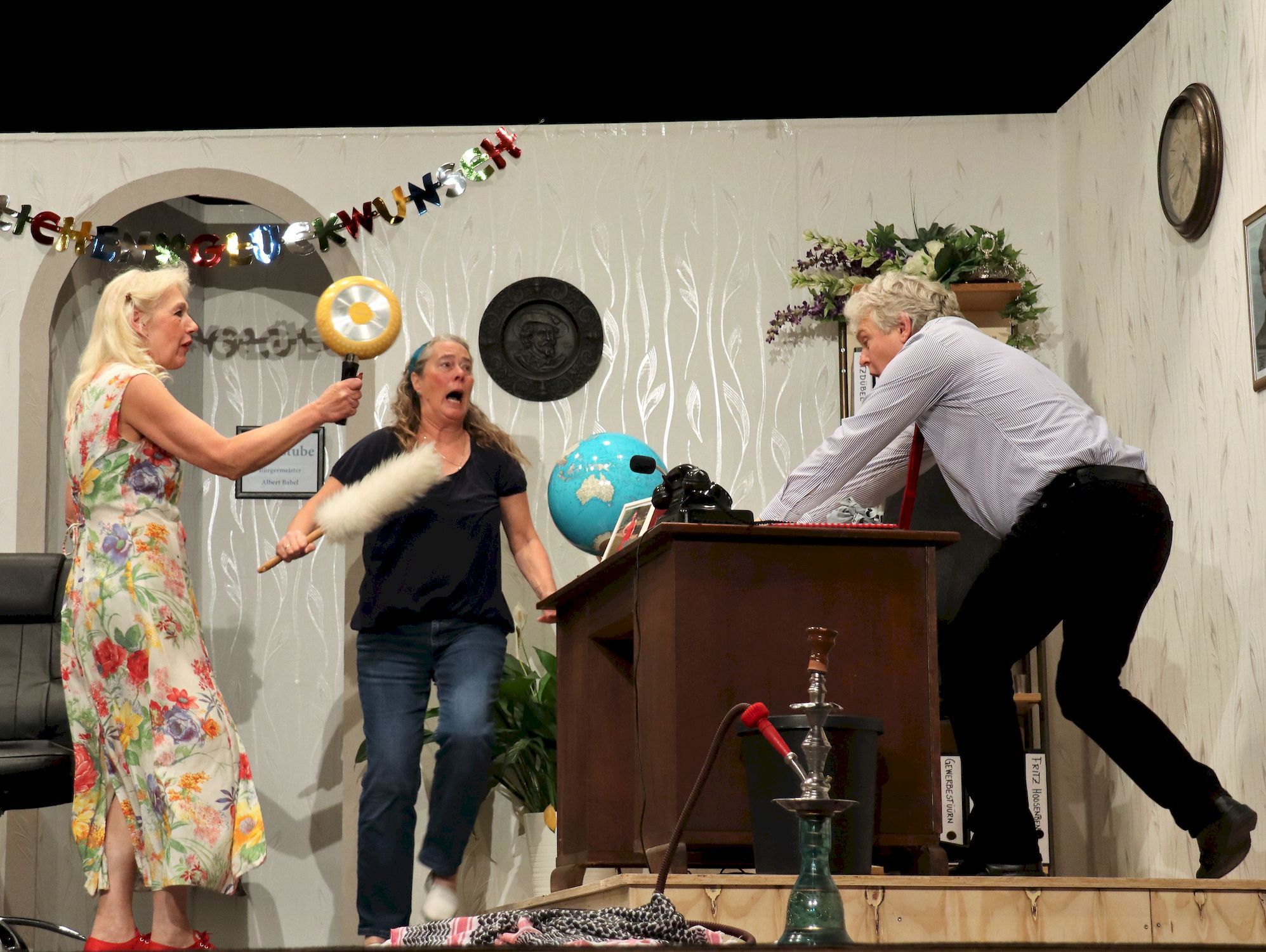Ihre Stammkundin Sandy, die sonst ihren Frühschoppen in der Kneipe einnimmt, muss in die Rolle einer feinen Dame schlüpfen. Ernas tollpatschiger Lebensgefährte Blöömke jagt als piekfeiner Kellner von einer Katastrophe in die nächste, der schweigsame Stammgast Heini und der arbeitslose Uwe weigern sich standhaft, die Kneipe zu verlassen. Der Bürgermeister Dieter Dröög ist gerade im Wahlkampf, während seine Frau Annabell nur so vor Ideen übersprudelt.